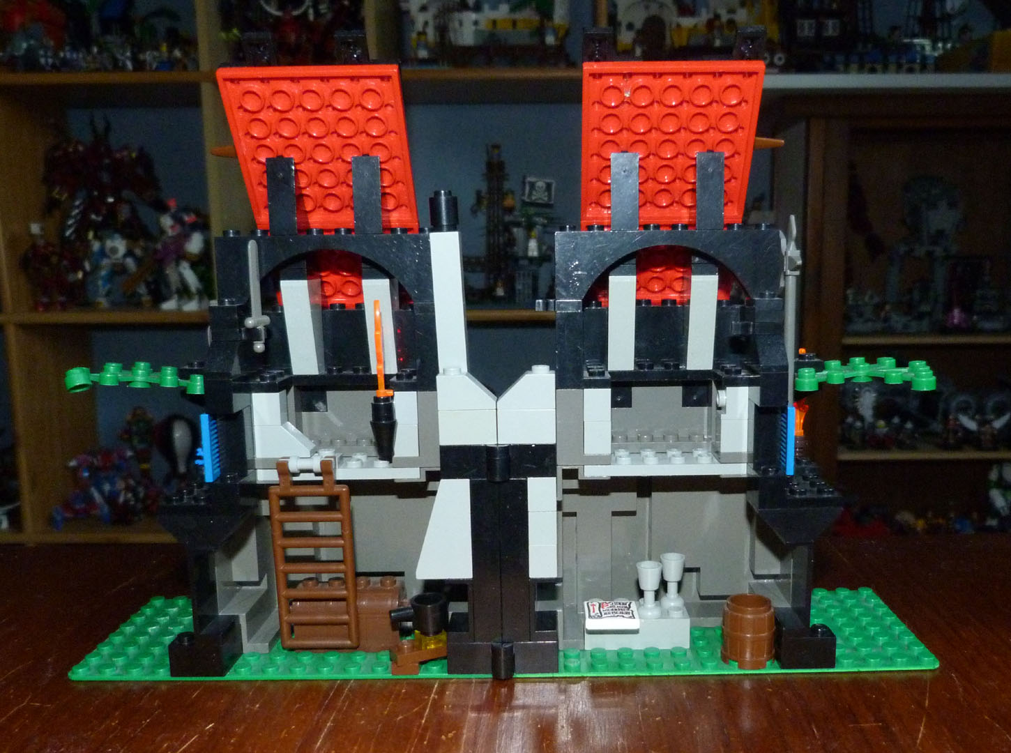 À propos de recyclage, c’est l’esprit de cet atelier. Proche sur le principe de la cachette des brigands (6054), il propose un mélange improbable d’environnement naturel et de construction humaine. Le résultat s’ouvre en deux grâce à des charnières pour révéler les pièces de vie et leur aménagement : une cuisine, un coffre au trésor, un bloc de pierre qui fait office de table pour poser des verres et un parchemin, mais pas de lit, on couche à la dure chez Toto la Magie.